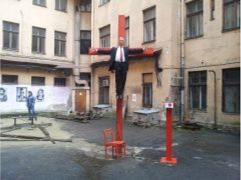 Mākslinieks personīgi atvainojas tiem, kas pārprata instalācijā pausto vēstījumu un atveidotās figūras sejas vaibstos saskatīja līdzību ar kaimiņvalsts prezidentu Putinu vai kādu citu sev tuvu cilvēku. Krustā sistās figūras seja esot veidota pēc līdzības ar kādu mākslinieka paziņu, 45 gadus vecu biznesmeni no Itālijas.